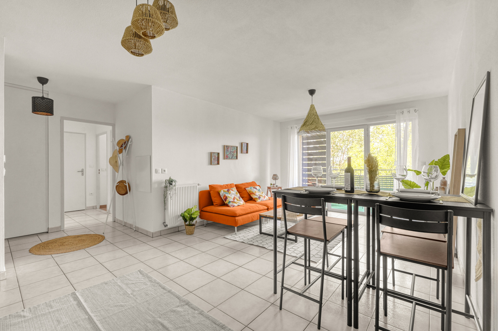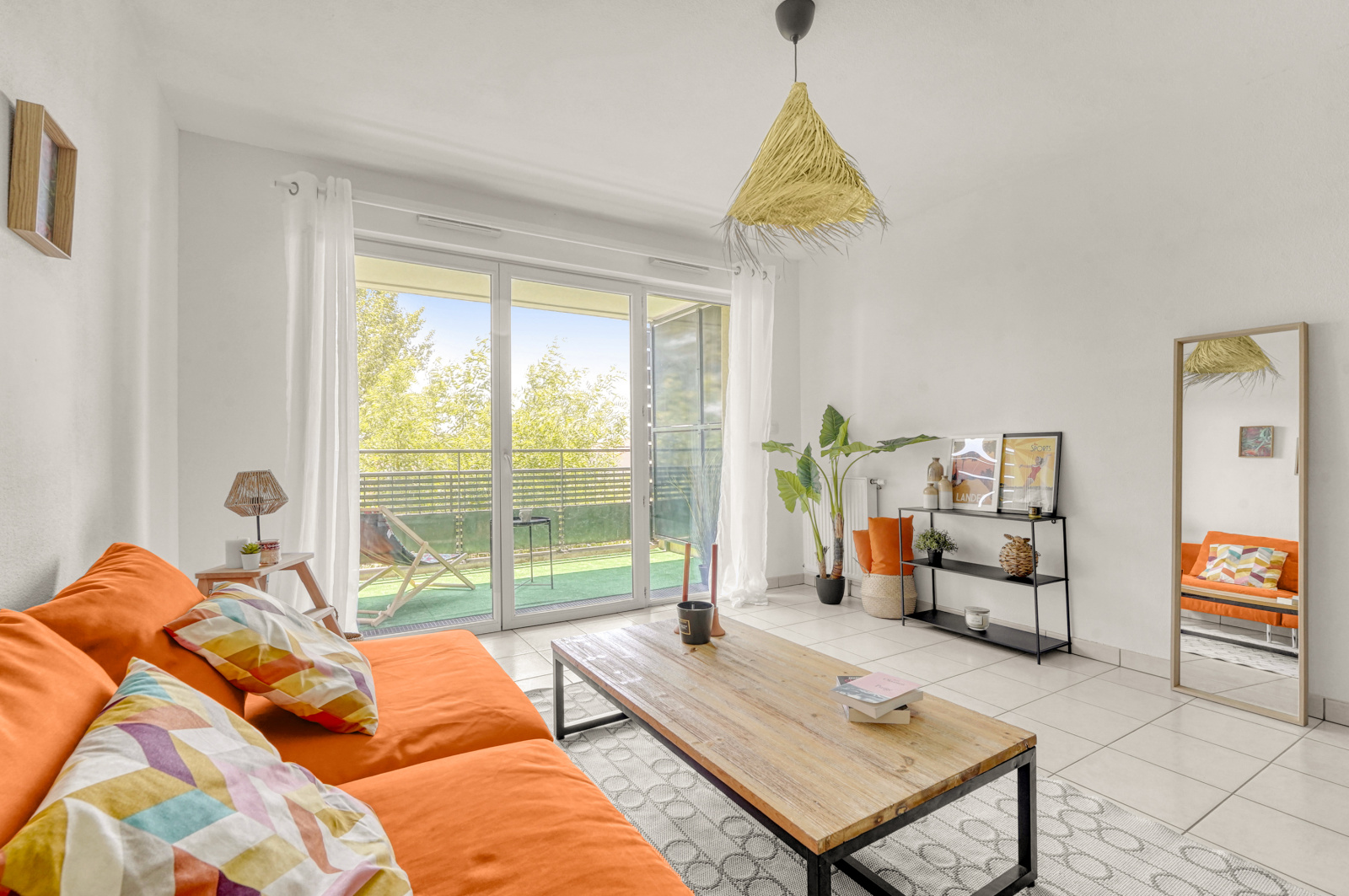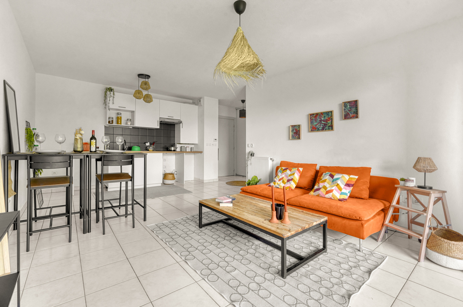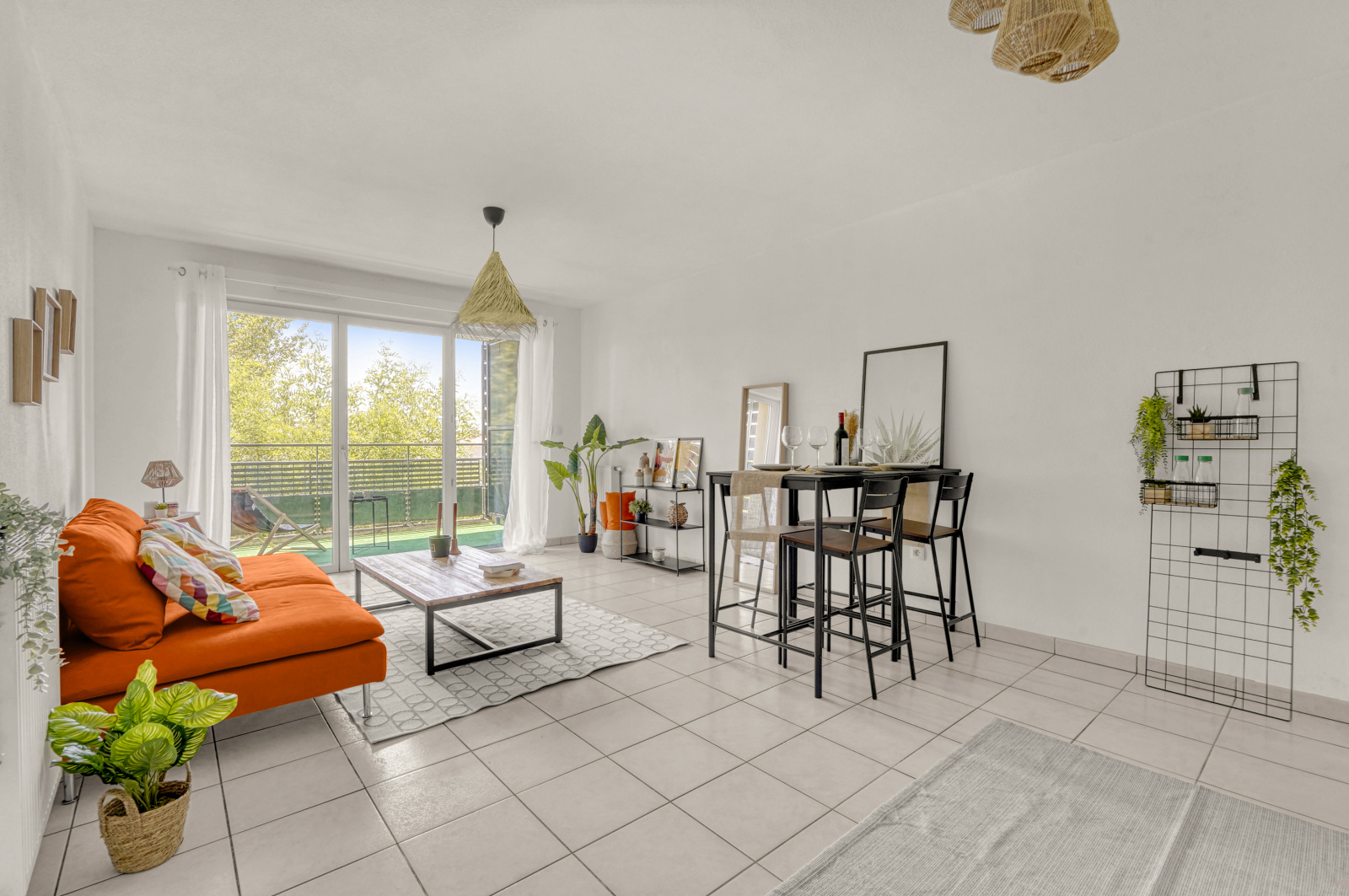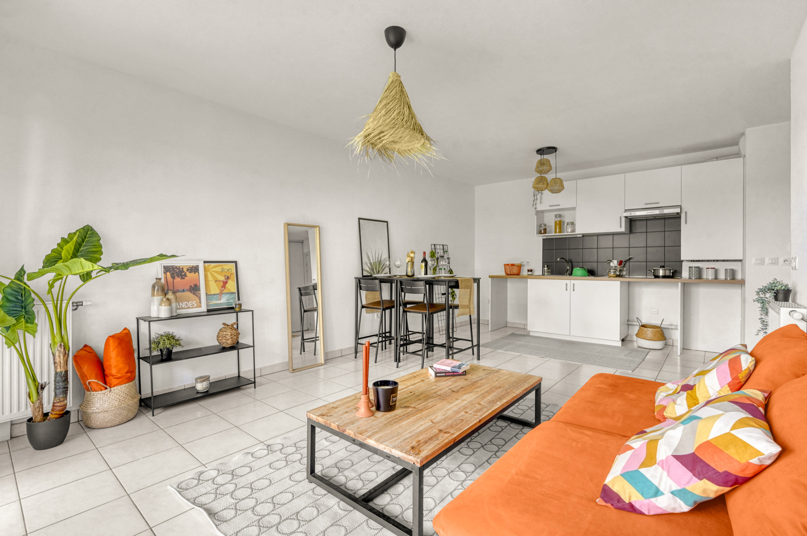 Pièce de vie d'environ 30m² avec cuisine équipée ouverte, accès à la TERRASSE de 8m² exposée SUD.