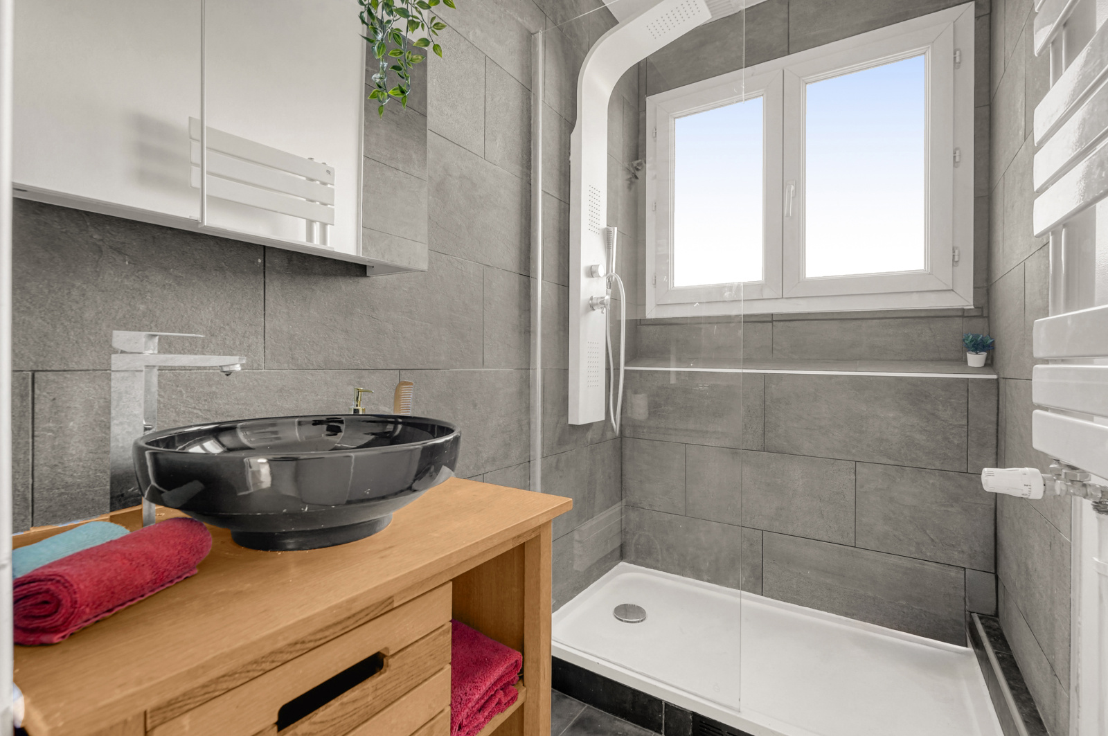 Salle d'eau avec fenêtre et wc séparés.