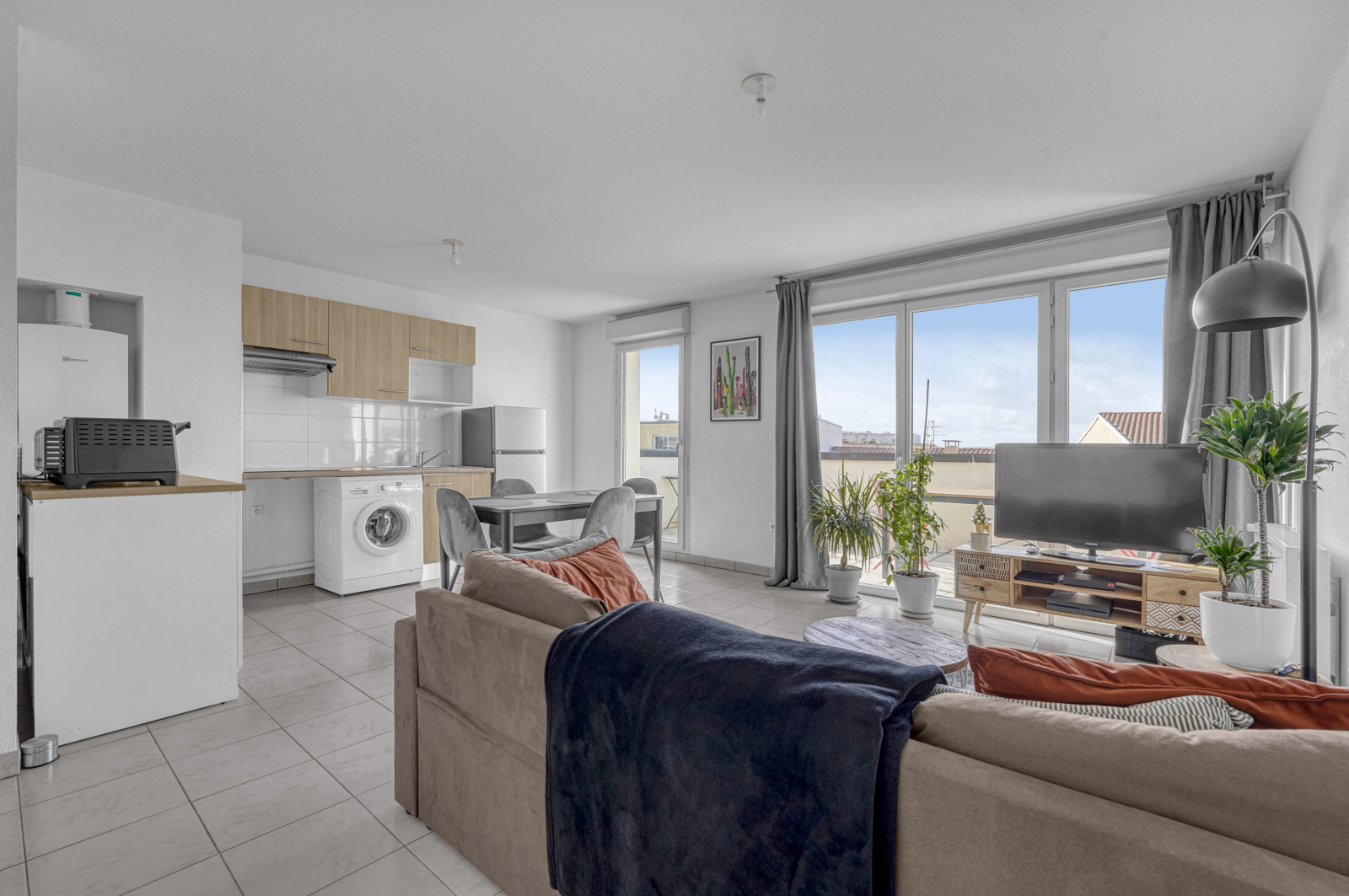 Pièce de vie avec cuisine équipée ouverte, accès à la TERRASSE de 25m² exposée OUEST