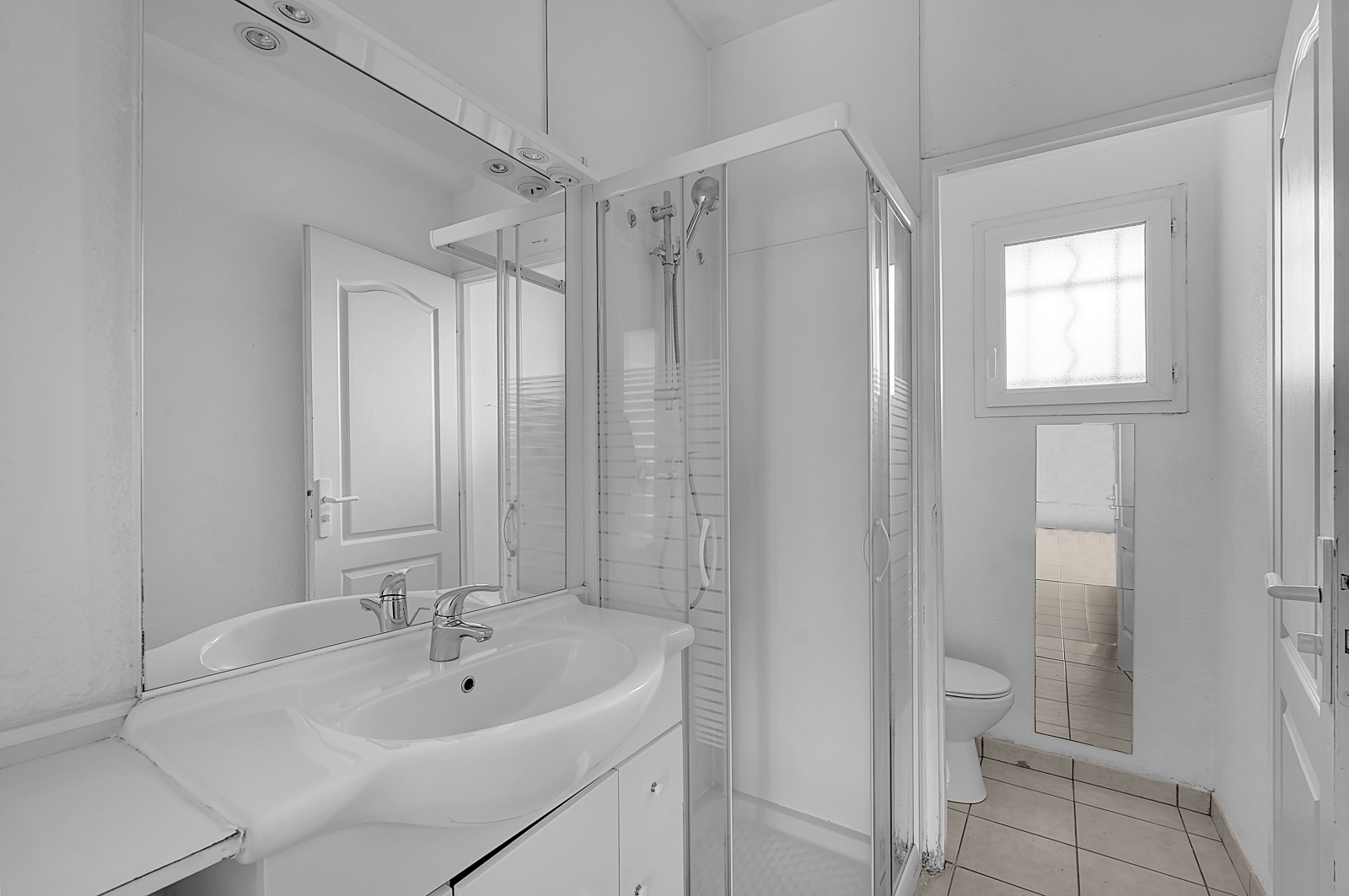 Placards + meuble simple vasque + cabine de douche + WC + ouverture
